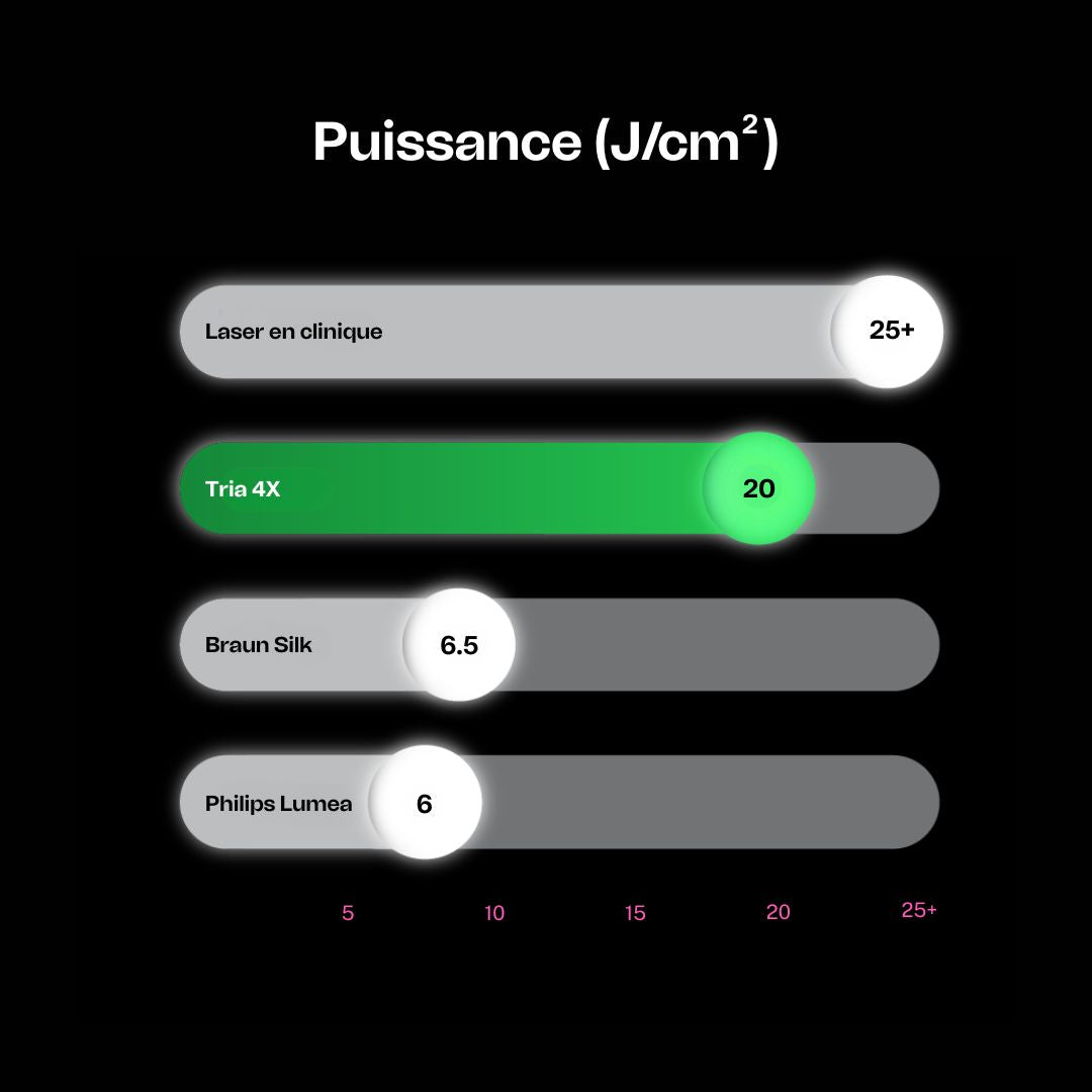 Philips Lumea 9000 : 6,5 J/cm² vs. Tria 4X à 20J/cm², soit plus du triple pour Tria, d’où laser plus fort = meilleurs résultats.